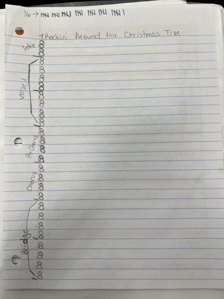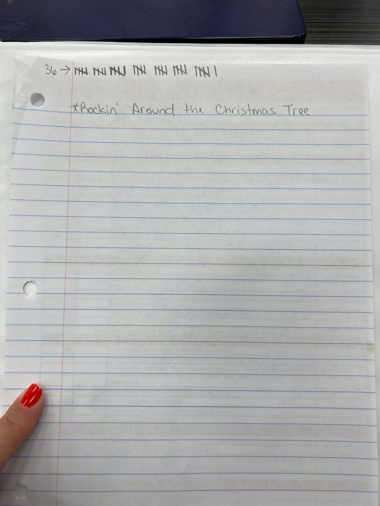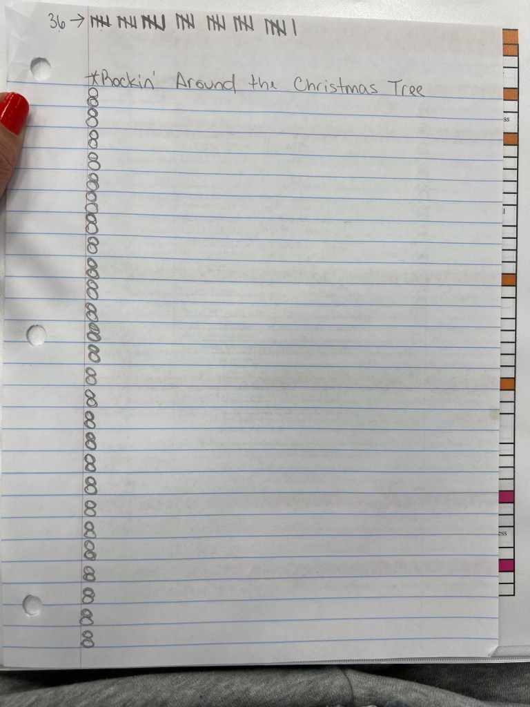 First, you’re going to sit down and count how many 8 counts you have in your music. Make sure if you are going to cut your music it’s already done before you start this exercise. We’re going to use ‘Rockin Around the Christmas Tree’ by Brenda Lee since we’re prepping for our Winter Progress Performance.